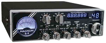 Magnum S9 CB Radio MAGNUM S-9 50+ Watt,AM/FM/SSB/PA,10 Meter Mobile Amateur Transceiver. Six Digit Frequency Counter SSB Five Digit AM/FM Frequency Counter OFF Switch, Roger Beep, Double Barrel 4-Pin Microphone Jacks; one on each side. Variable Power Output Control TURBO™ Digital Echo with Dual Controls. AMT - All Mode Talkback with Volume Control on Front Panel TOP GUN™ Modulator - A Magnum Exclusive!· Turns the S-9's transmitter section into a modulator· With 1 watt carrier - swing to 50+ watts!· 100% modulation for un-believable power.· Modulator On/Off Control on Front Panel. TOP GUN™ Compressor - A Magnum Exclusive! · Compressor Improves Transmitted Audio· Helps Punch Through Crowded Airwaves. Exceptional Receiver Clarity. Blue LED Meter And Display Lights. Three Stage Dimmer. Smooth RF Gain Control. SWR Warning Light with On/Off Control Large Easy To Read S/RF Meter. Meter Light Changes To Red During Transmit +10kHz Switch Microphone and RF Gain,Noise Blanker / ANL. Fine And Coarse Clarifier For Adjusting RX & TX.. |